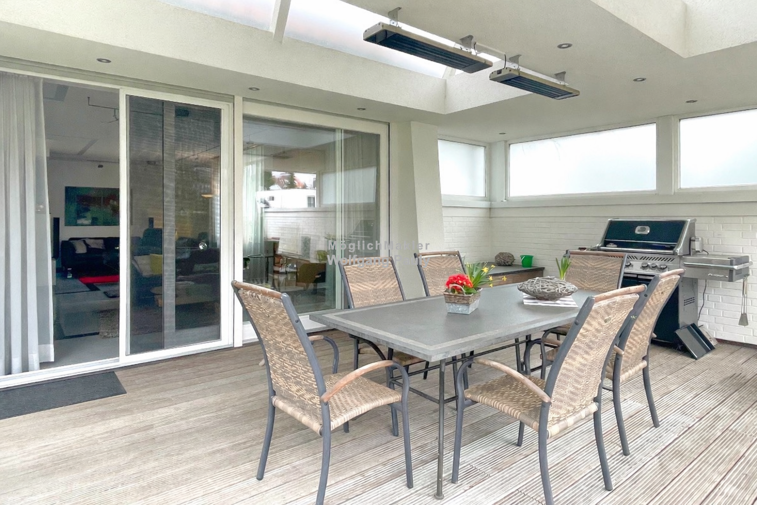 Im Inneren überzeugen maßgefertigte Einbauten, Naturstein- und Holzböden sowie helle, moderne Bäder. Alles wirkt klar strukturiert, hochwertig und aufgeräumt. Draußen wird es entspannt: Die wirklich große Terrasse (ca. 60 m²) ist wie gemacht für den Feierabend, gemeinsame Runden mit Freunden und lange Sommerabende, während die automatische Gartenbewässerung mit eigenem Brunnen und Mähroboter dafür sorgen, dass der Pflegeaufwand angenehm gering bleibt. Carport, Stellplätze und der Keller bieten reichlich Stauraum, auf Wunsch ergänzt um eine moderne Küche mit Markengeräten.