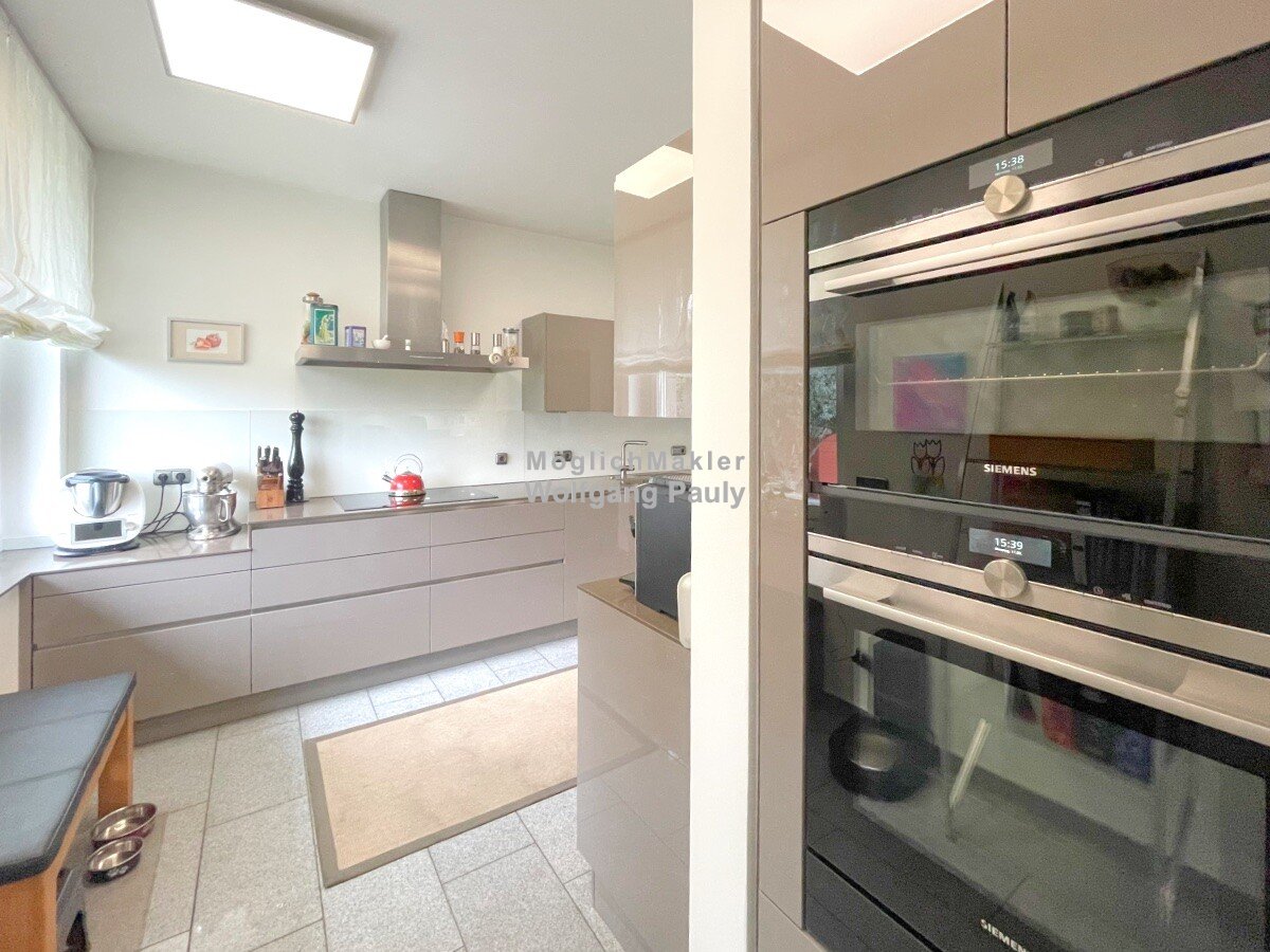 Die hochwertige anthrazitfarbene Hochglanzküche mit extra dünner Arbeitsplatte sowie erstklassige Elektrogeräte von Siemens.