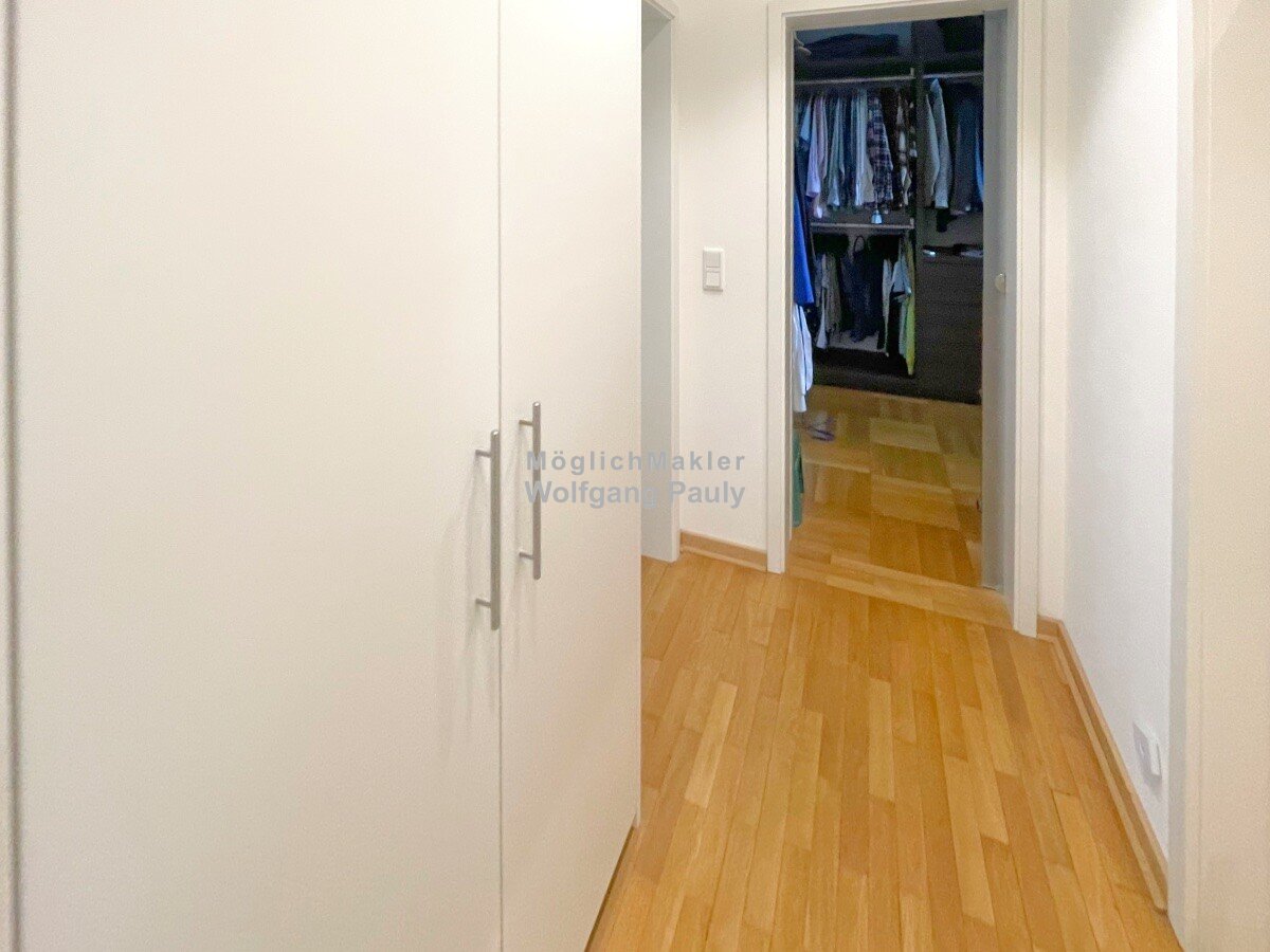 Der private Trakt im EG umfasst ein Schlafzimmer sowie ein komfortables Masterbad mit Eckbadewanne, Dusche und Bidet, dazu Garderobe und Ankleide mit hochwertigen Einbauten. Im DG stehen vier weitere Zimmer, eines davon mit Küchenanschlüssen sowie ein Abstellraum zur Verfügung. Hier lassen sich flexibele Schlaf-, Arbeits- oder Gästebereiche realisieren. Die Galerie verbindet beide Ebenen optisch und trägt zum großzügigen Raumgefühl bei. Praktisch abgerundet wird das Angebot durch einen Stellplatz für Mülltonnen und Fahrräder direkt neben dem Haus.