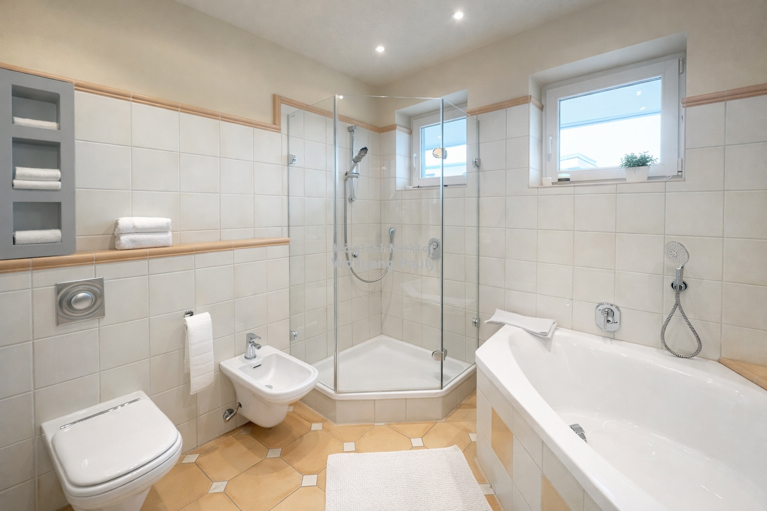 EG: Masterbad mit Eckbadewanne, Dusche, Bidet, Einbauspots und Tageslicht aus 2000