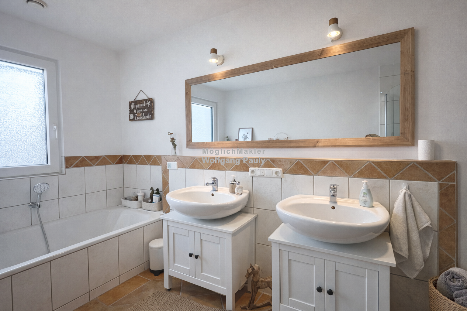 OG: zwei Waschbecken, Wannen- / Duschbad mit Tageslicht sowie Anschluss für Waschmaschine und TrocknerDach: