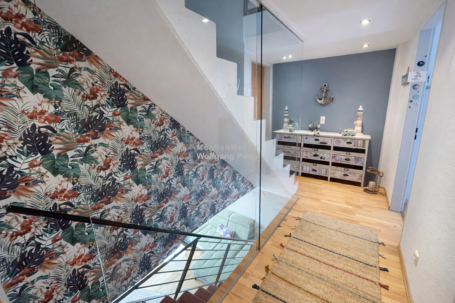 Hell und einladend, genießen Sie den offen gestalteten Wohnbereich mit großer Fensterfront und direktem Gartenzugang. Moderne Treppenanlage mit markantem Metallgeländer als architektonisches Highlight.