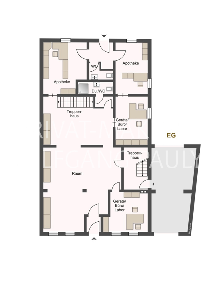 Das 3-Parteien Haus wurde Rahmen einer umfassenden Kernsanierung um einen Anbau im Erdgeschoss (EG) erweitert. Seitdem bietet das Erdgeschoss inkl. Untergeschoss (UG) eine funktionale Gewerbeeinheit, die aktuell als Apotheke genutzt wird. Im Obergeschoss (OG) und Dachgeschoss (DG) befinden sich zwei großzügige, helle Wohneinheiten, die durchdacht aufgeteilt sind. Das Gebäude ist vollständig unterkellert und bietet auch hier eine räumliche Trennung zwischen Gewerbe und Wohnen.